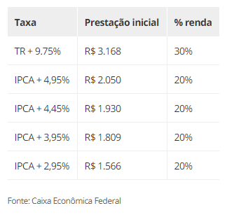 Atualmente, de acordo com a Caixa, a taxa mínima é composta pela Taxa Referencial + 8,5% ao ano; e a taxa máxima, por TR + 9,75%.